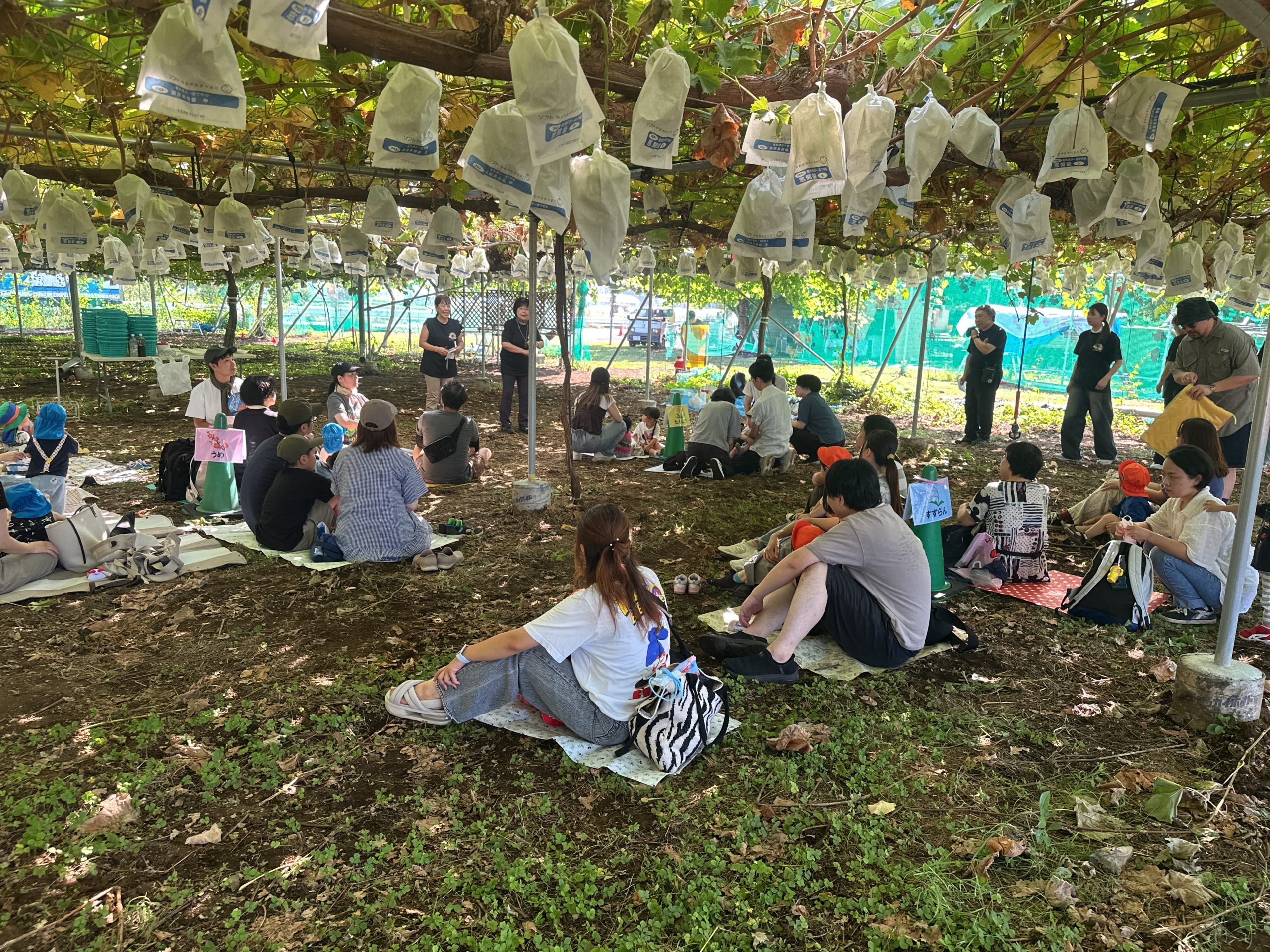 子どもたちは、ワクワクしながらぶどうに挟みを入れました。